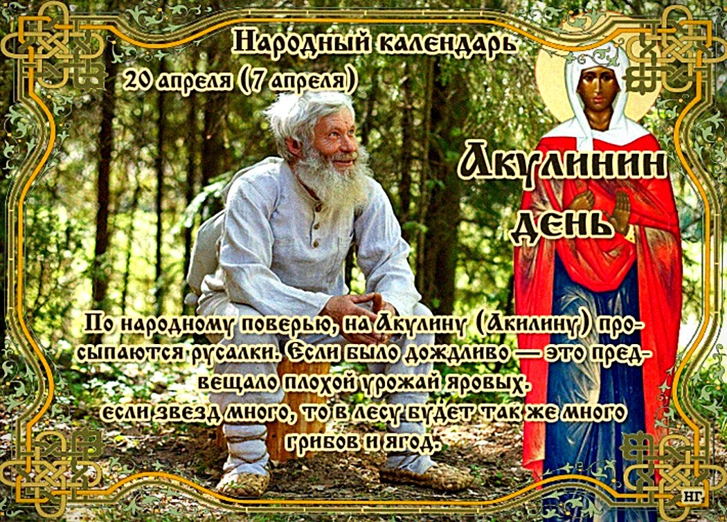 Во вторник 20 апреля 2021 года в народном месяцеслове – Акулина, Акулинин день. Православная церковь сегодня почитает память мученика Руфина, диакона, мученицы Акилины Младшей и с ними 200 воинов, пострадавших за Христа около 310 года при императоре Максимиане. Когда святого диакона Руфина за исповедание христианской веры посадили в темницу, дева Акилина заботилась о нём и за это была взята под стражу. Находясь в темнице своими чудесами они обратили в христианство 200 воинов, и вместе с ними были усечены мечом.