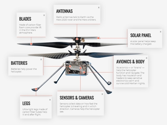 Дрон весит около 1,8 кг, его разработка обошлась в $85 млн. В NASA ранее отмечали, что основной проблемой для такого аппарата станет то, что атмосфера Марса сильно разрежена. «Плотность атмосферы Марса составляет лишь 1% от земной, поэтому, когда вертолет будет даже просто находиться на поверхности планеты, для него это будет эквивалентом земных 30 км высоты», — рассказывал автор проекта.