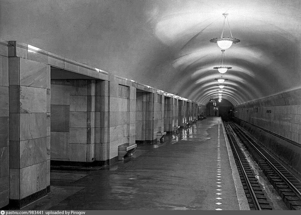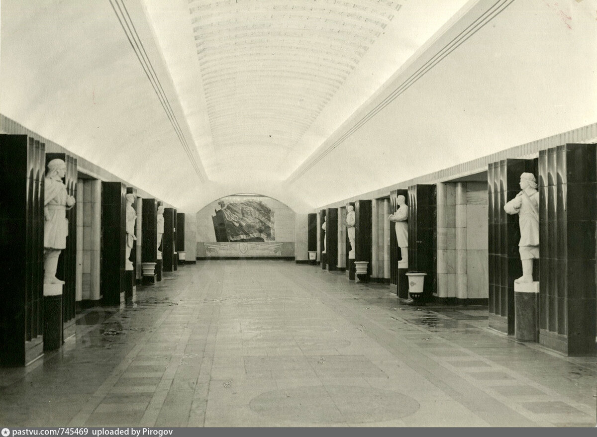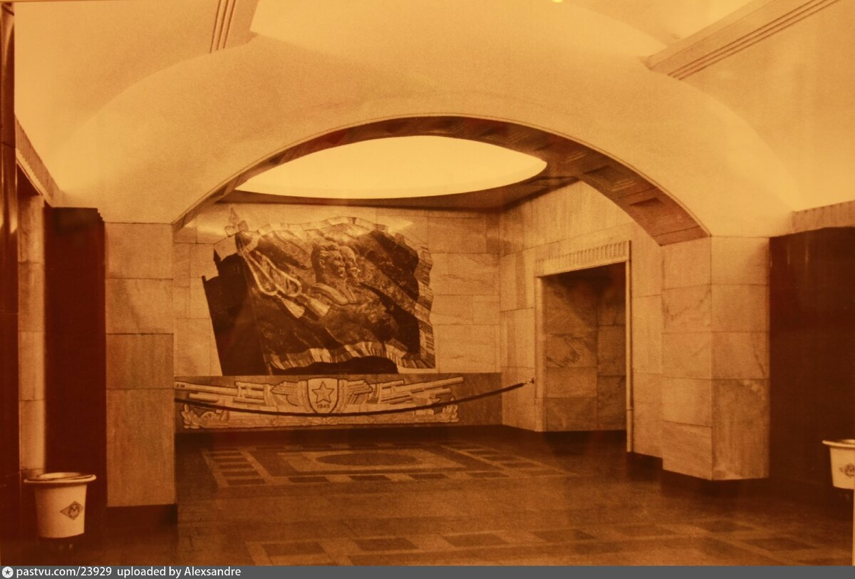 Завершили украшении станции полом из красного и чёрного гранита, а также оригинальным мраморным панно. Его разместили в торце, там где находится аванзал. Композиция изображала знамёна. На переднем плане были профили Сталина и Ленина. После того, как главой государства стал Н.С. Хрущёв, #московское метро постепенно лишалось украшений с Иосифом Виссарионовичем.