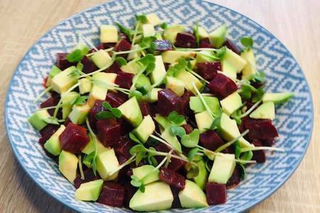 Смешиваем свеклу с заправкой. Чистим авокадо, нарезаем кубиками и солим.