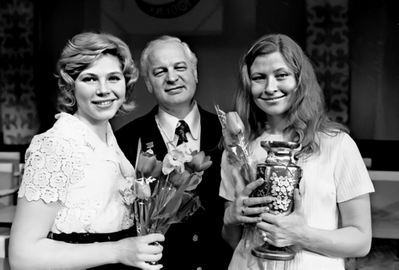 Награды за Фильм «А зори здесь тихие». На фото Станислав Ростоцкий, Людмила Зайцева и Елена Драпеко.