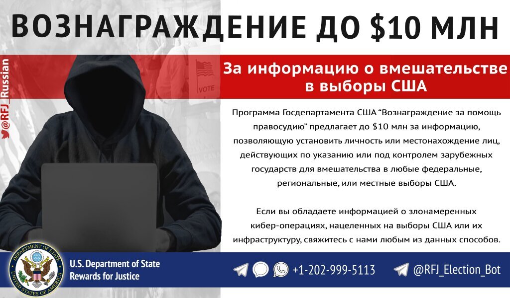 В рамках этой программы Госдеп предлагает вознаграждение в размере до $10 млн за «информацию, позволяющую установить личность или местонахождение любого лица, которое, действуя по указанию или под контролем иностранного правительства, вмешивается в выборы в США, участвуя преступных кибер-операциях».