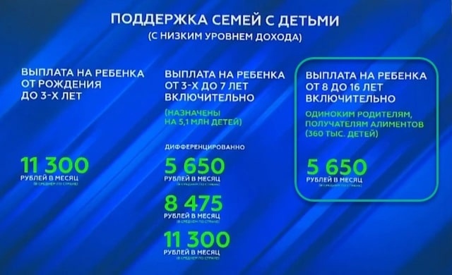 21 апреля 2021 г. в ходе оглашения ежегодного послания Федеральному собранию Владимир Путин объявил о новых мерах поддержки граждан, в том числе семей с детьми. Одним из самых значимых решений стало заявление о поддержке неполных семей, — ежемесячных выплатах на детей от 8 до 16 лет включительно, которые воспитываются в таких семьях.