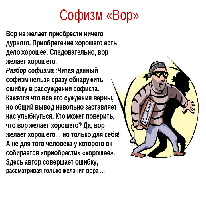 Аристотель называл софизмом «мнимые доказательства», в которых обоснованность заключения кажется верной и обязана чисто субъективному впечатлению, вызванному недостаточностью логического или семантического анализа. Убедительность на первый взгляд многих софизмов, их «логичность» обычно связана с хорошо замаскированной ошибкой: