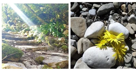 Маршрут проходит среди сказочного леса с цветами и деревьями, заросшими мхом и лианами, вдоль бурлящей горной речки Хоста, лабиринтов из скал, пещеры и живописного водопада.