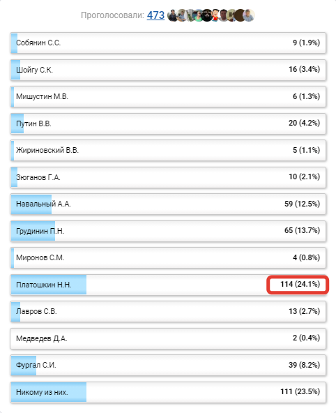 Даже проведенный мною в январе 2021 года опрос: «Доверие политикам. Итоги января. Сегодня и сейчас я доверяю только одному…», зафиксировал убедительную победу героя публикации над всеми старожилами политического бомонда.