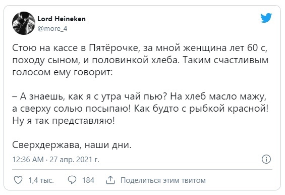Вот сидим мы с дедом на ступеньках магазина - он третью луковицу дожёвывает, сам плачет. Я курю и плачу. Молчим оба, всё понимаем. До чего страну-то довели?