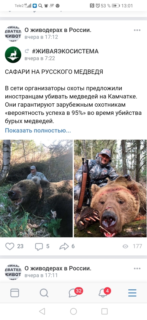 Юлия, есть места где без мехов не выжить зимой. Что делать? Может Вы посоветуете травой укрываться? Просто не надо жестокость напоказ выставлять. В жизни ситуации всякие бывают. Я сам видел и присутствовал в таких ситуациях. Я встречаю ежедневно (кроме зимы) бурых медведей, но я ни разу не выстрелил в медведя. Если Вы не попадали в ситуации с дикими животными, то ине надо судить со своей колокольни. Я против жестокости и выкладывания кадров в сеть.