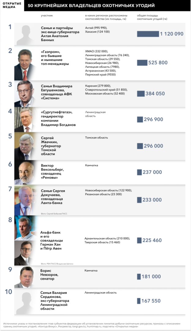 Более 25 территорий Москвы, почти полторы Московских области или две Бельгии — вот с чем можно сравнить площадь охотничьих угодий, принадлежащих российской элите. «Открытые медиа» подсчитали: за федеральными чиновниками и политиками, госкомпаниями и бизнесменами из списка Forbes закреплено более 5,884 млн га охотничьих угодий. Высокопоставленные охотники, как и полагается настоящим феодалам, обзаводятся обширными охотхозяйствами по всей России.