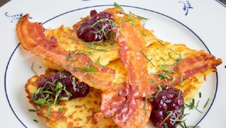 Сочетание картофельных блинов и бекона с брусничным соусом кому-то может показаться странным, однако в Швеции их подают именно так. Хотя, вполне можно подать и без соуса, или заменить его сметанным с грибами – тоже очень интересный вариант.