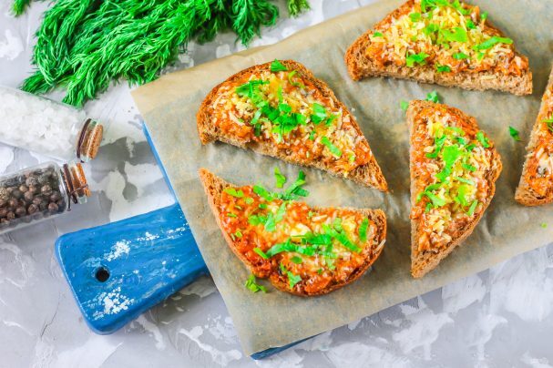 Ломтики хлеба смазать маслом, выложить на них очищенные кильки – по 3 штуки на каждый ломтик. Сверху на рыбу положить репчатый лук. Поставить тарелку с бутербродами в микроволновку и запекать при максимальной мощности в течение 2-х минут. Украсить рубленой зеленью.