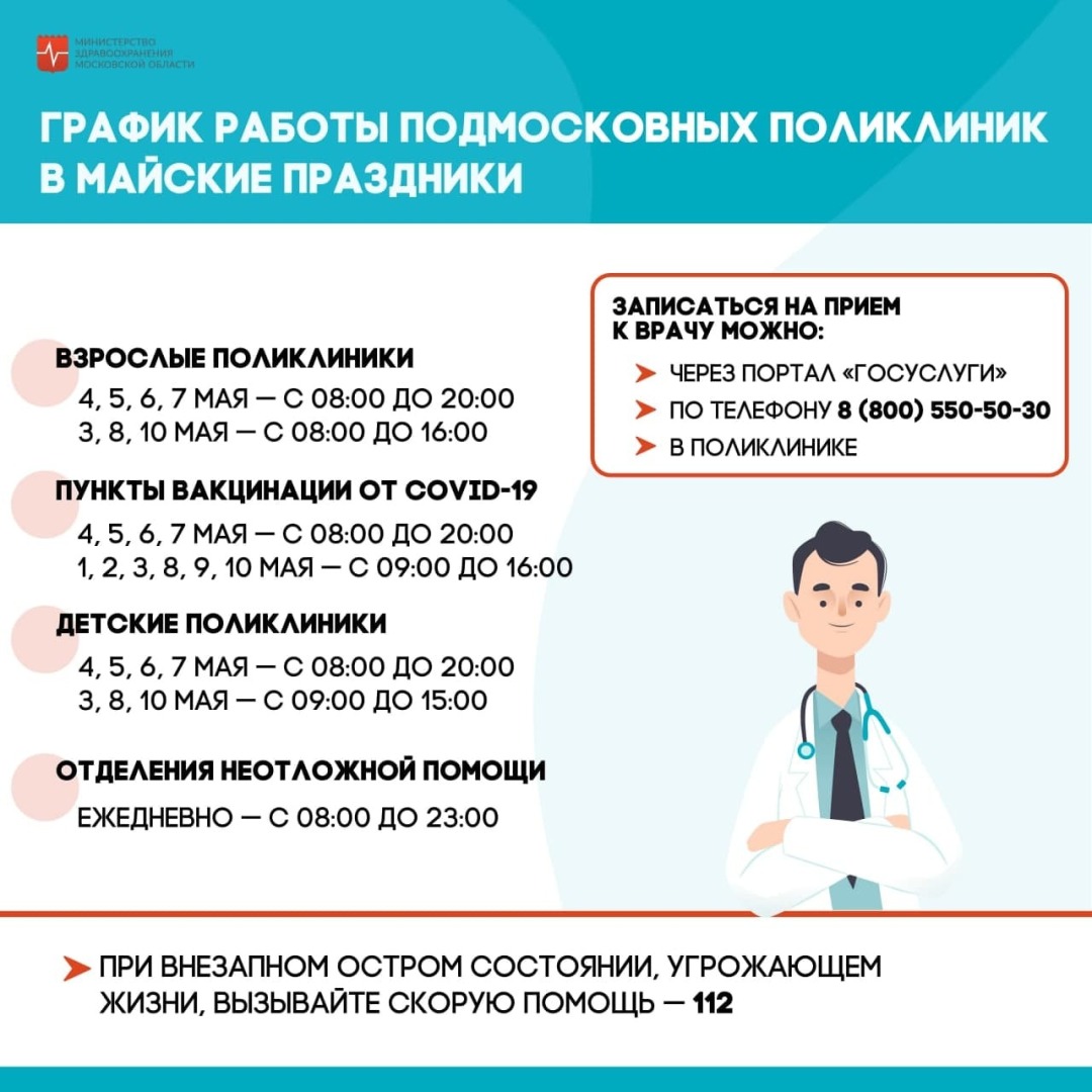 Кроме того, определен график работы государственных подмосковных медорганизаций в первую декаду мая. Амбулаторно-поликлиническая служба, оказывающая помощь взрослому населению, доступна 4, 5, 6, 7 мая – с 8 до 20 часов, а 3, 8 и 10 мая – с 8 до 16. В медорганизациях, оказывающих амбулаторную медицинскую помощь детям, прием будет проводиться 4, 5, 6, 7 мая – с 8 до 20 часов, а 3, 8 и 10 мая – с 9 до 15. Отделения неотложной помощи в поликлиниках работают ежедневно с 8 до 23 часов.