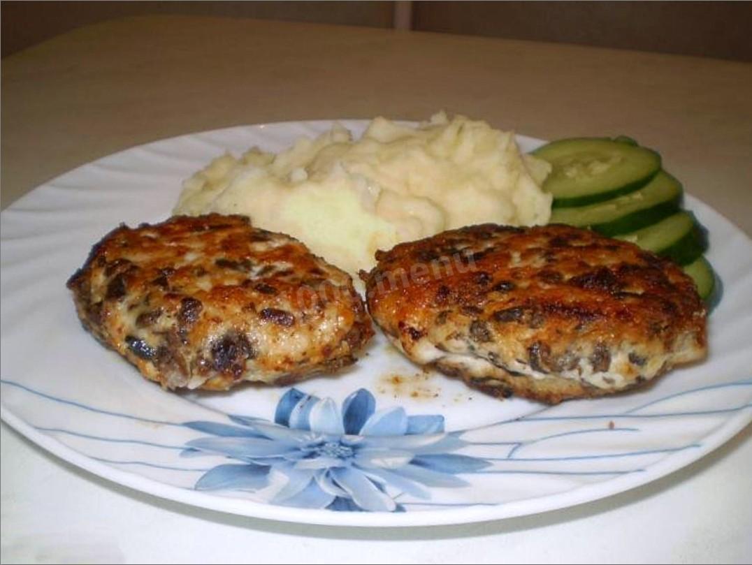 Зелень петрушки мелко порубить и добавить к обжаренным грибам. Из приготовленного фарша нужно сформовать котлеты, добавляя внутрь каждой по ложке обжаренных грибов. Котлеты обвалять в панировочных сухарях и обжарить на растительном масле до золотистого цвета.