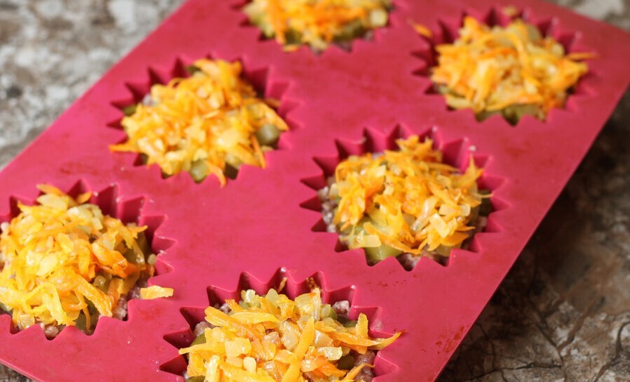 Первым делом очищаем лук и морковь, затем только одну луковицу режем мелким кубиком, а морковку натираем на крупной терке. Далее в сковороду наливаем немного растительного масла, разогреваем его, выкладываем измельченные овощи и обжариваем до мягкости, помешивая лопаткой, в течение нескольких минут и выключаем. Теперь берём оставшуюся вторую головку репчатого лука натираем на терке или измельчаем в блендере, или же прокручиваем через мясорубку и смешиваем с фаршем. Добавляем измельченный чеснок, солим и перчим фарш, по желанию приправляем другими специями. Вымешиваем руками. Если фарш после перемешивания получается не вязким, распадается в руках, добавляем яйцо и перемешиваем снова. Но по опыту хочу сказать, что без яйца получается сочнее. Теперь берем любые формочки для выпечки кексов (можно использовать и одноразовые) выкладываем в них фарш, примерно по 3 ч. л. Слегка утрамбовываем. Теперь мелко нарезаем маринованные или солёные огурчики и выкладываем их поверх фарша. Сверху распределяем морковно-луковую обжарку. Затем нарезаем помидор кружочками и выкладываем по одному кружочку в каждую форму. Отправляем запекаться в разогретую до 180 градусов духовку на 25 минут.