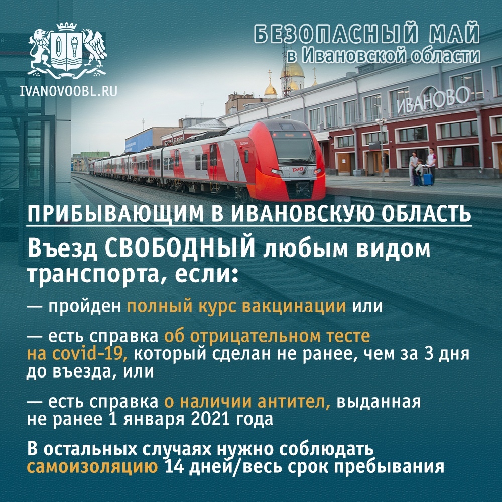 По решению регионального оперативного штаба свободно въехать в регион смогут только те, кто прошел полный курс вакцинации, или у кого есть справка о наличии антител к Covid-19, выданная не ранее 1 января 2021 г., или отрицательный ПЦР-тест, сделанный не ранее, чем за 3 дня до поездки. Без этих документов придется сидеть на карантине 14 дней (то есть дольше, чем длятся сами майские праздники). Проверять справки будут на контрольных пунктах на въездах в регион, кроме того, предъявить их придется и при заселении в гостиницы, санатории, дома отдыха. Ограничения касаются и туристических групп, прибывающих в Ивановскую область на автобусах и теплоходах.