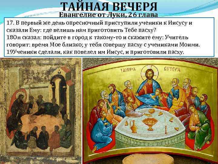 «В первый же день опресночный приступили ученики к Иисусу и сказали Ему: где велишь нам приготовить Тебе пасху? Он сказал: пойдите в город к такому-то и скажите ему: Учитель говорит: время Мое близко; у тебя совершу пасху с учениками Моими». (Мф. 26:17–18)
