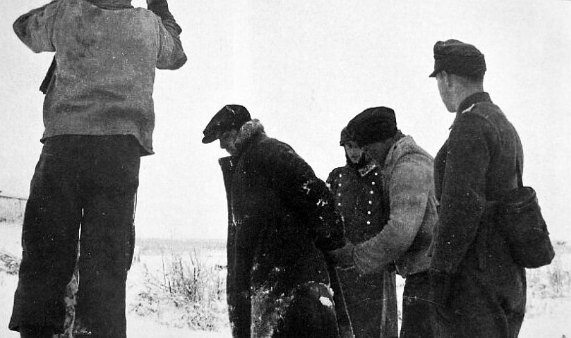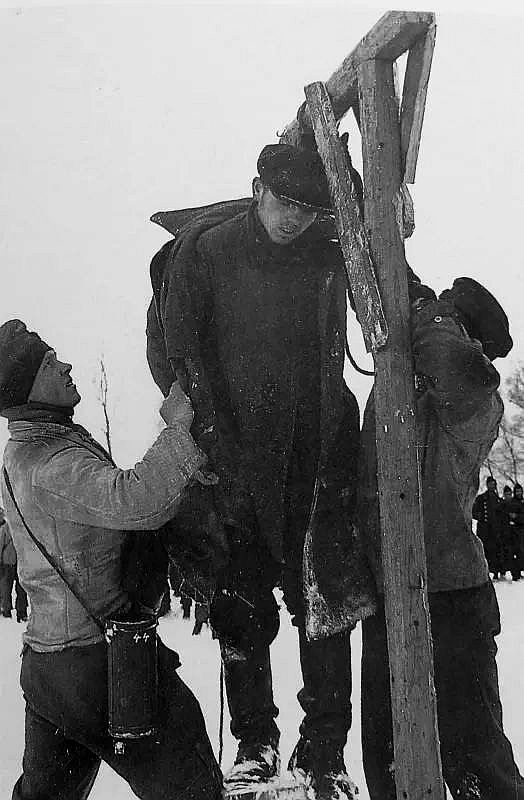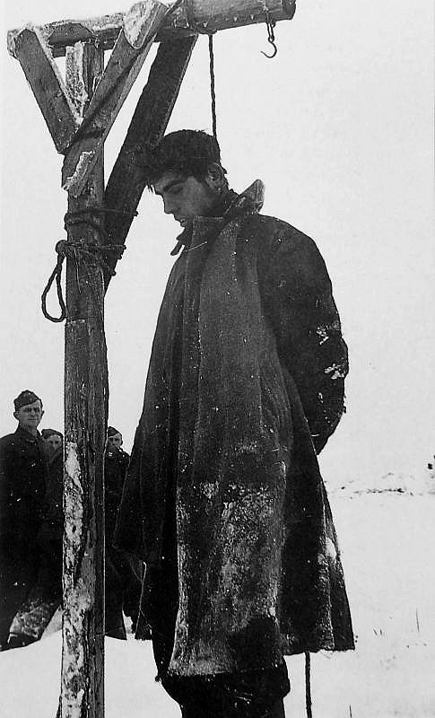 Фашистские солдаты осуществляют казнь советского гражданина пойманного без документов на дороге к населённому пункту Большие Ветры (Курская область). Назвать своё имя задержанный отказался..