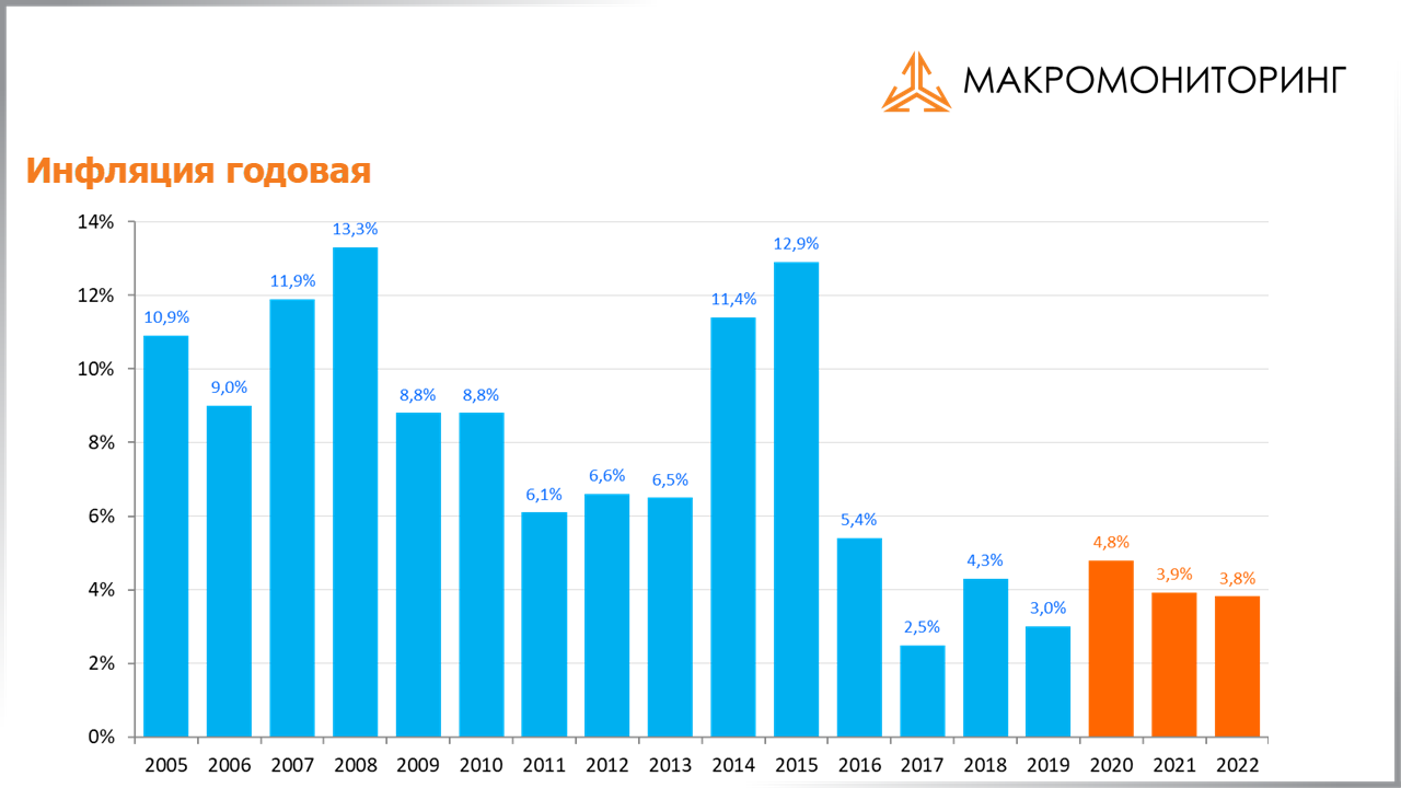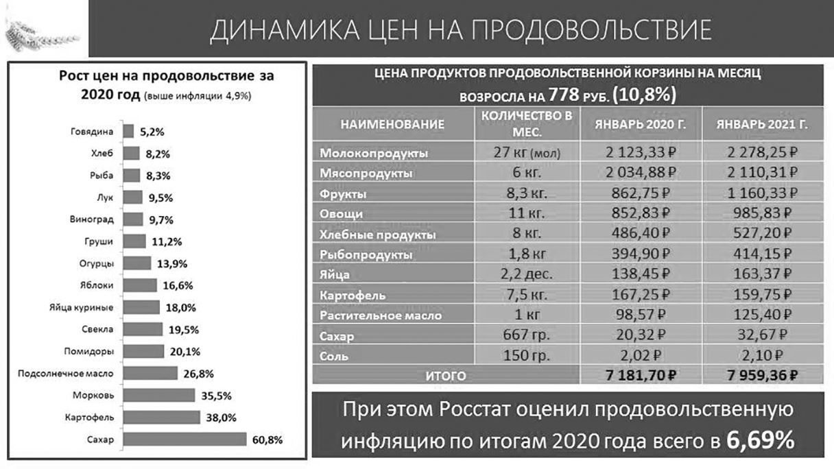 Есть у нас такая структура - Федеральная служба государственной статистики (Росстат). Официальная информация - у нас всё хорошо, мы движемся правильным курсом. Инфляция по итогам 2020 года всего около 5%.