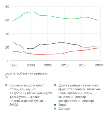 В 2000 году Роберт Манделл предсказывал, что к 2010 году зона евро будет расширена до 50 государств, в то время как зона американского доллара распространится по всей Латинской Америке, а большинство стран Азии перейдут на японскую иену. Сегодня эти прогнозы вызывают улыбку. Доля евро в резервах центральных банков в действительности пока ни разу не превысила совокупную долю европейских валют, использовавшихся в качестве резервных до введения евро: немецкой марки, французского франка, голландского гульдена и расчетной единицы ЭКЮ. Более того, достигнув максимального значения в резервах в 2009 году на уровне чуть более 27%, доля евро впоследствии снижалась, опустившись по итогам трех кварталов 2020 года до 20%, в то время как доля доллара США составляет около 60%. Евро быстро догоняет растущая доля прочих резервных валют, куда входят британский фунт стерлингов, японская иена, канадский и австралийский доллары, а после 2016 года и китайский юань (см. график). То же самое можно сказать и о роли евро как средства международного инвестирования. В то время как доллар США по-прежнему выглядит мощно, вторую позицию здесь занимает не евро, а китайский юань.