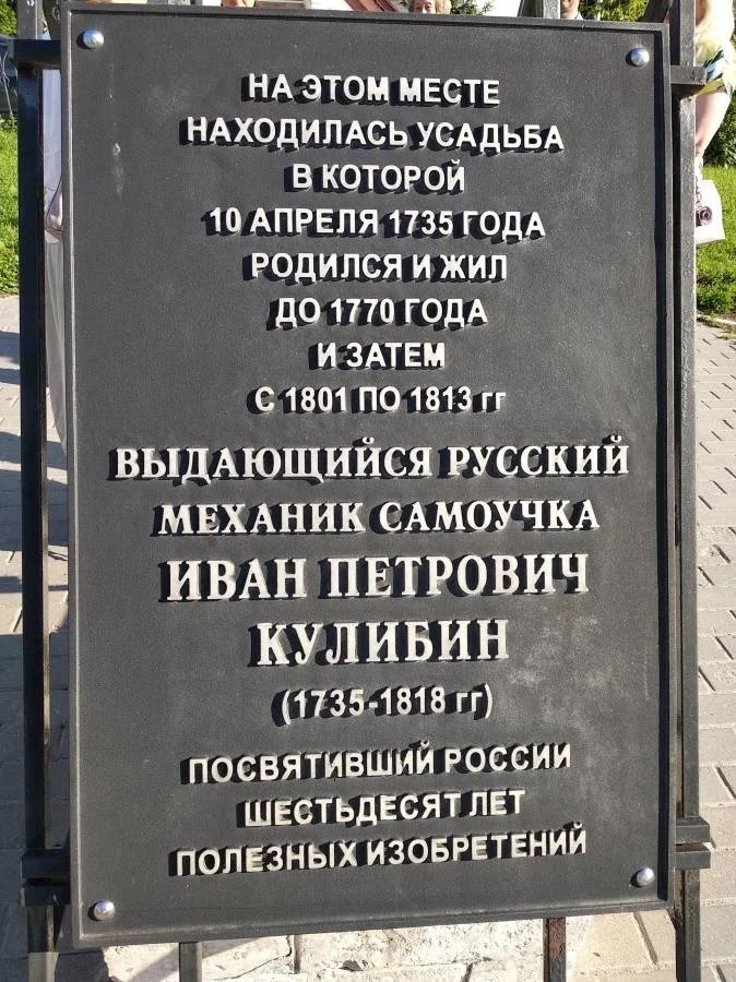 Памятная плита на месте дома в Нижнем Новгороде, где родился Кулибин И. П. Фото взято с ресурса Яндекс. Картинки