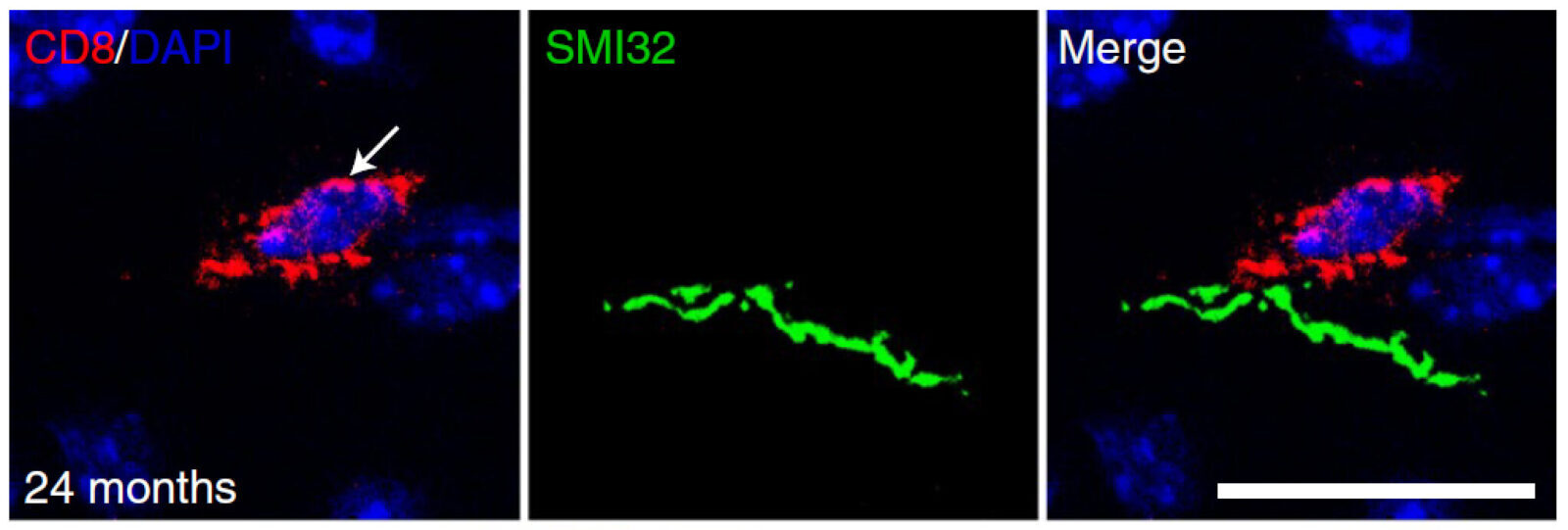 Микроскопическая картина CD8 + Т-клетки в ЦНС двухлетней мыши. Цитотоксическая Т-клетка (красная маркировка) расположена в непосредственной близости от поврежденного нервного волокна (зеленая маркировка) и, согласно описанным результатам, участвует в его повреждении. Ядра всех тел клеток на изображении отмечены синим цветом. Масштабная линейка: 20 мкм. Предоставлено: Янош Гро, перепечатано с Springer Nature.
