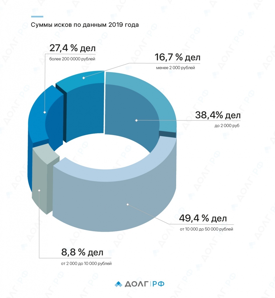 По данным 2019 года, иски с суммой более 200 тыс. руб. составляли всего 27,4% от общего числа дел. В остальных заявлениях сумма претензий была меньше. Причем в 16,7% случаев сумма исков была менее 2 тыс. руб. В 38,4% случаев иски до 2 тыс. руб. подавали государственные органы. В 49,4% ситуаций суды рассматривают иски от 10 до 50 тыс. руб., поданные ПФР. На иски от 2 до 10 тыс. руб. в судах пришлось 8,8% дел.
