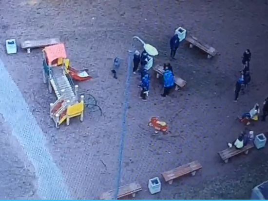 На кадрах видно, как женщина в ярко-синей куртке целенаправленно подошла к сидящим на лавочке школьникам и несколько раз ударила одного из них по голове. Мальчик прикрывал голову руками, спасаясь от ударов. Затем женщина некоторое время что-то выговаривала ему, после чего вытолкала с площадки.