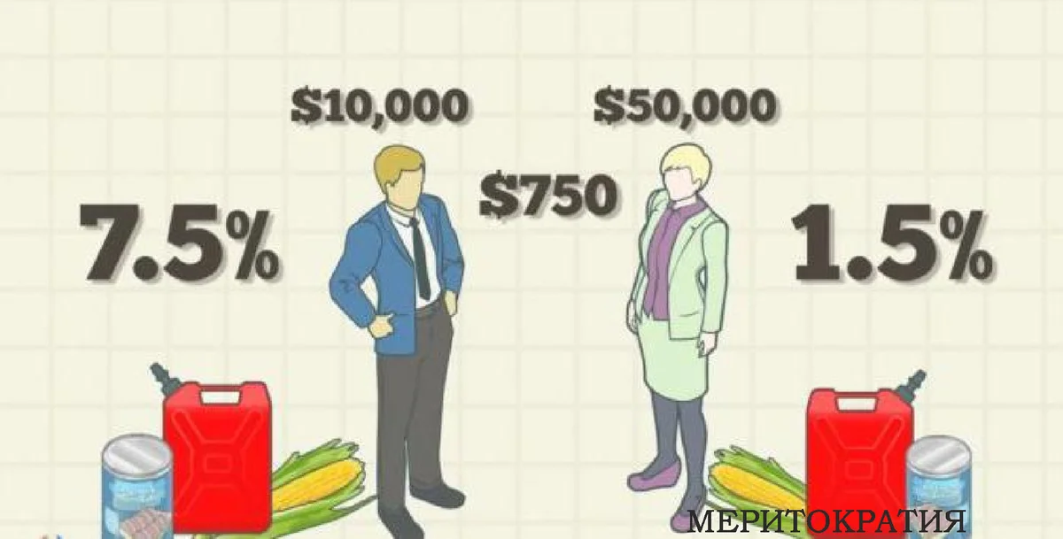 А чем ты беднее, тем меньше тебе удается откладывать денег. Богатый мог бы тратить больше, но ему это не нужно. Таким образом, налоговая система де-юре остается пропорциональной, но де-факто становится регрессивной.