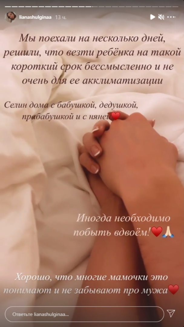 Невестка певицы Валерии Лиана Шульгина призналась в сторис Instagram****, что ей пришлось на время оставить маленькую дочь. Молодая мать вместе с мужем Арсением Шульгиным улетели отдыхать в Абу-Даби, ОАЭ.