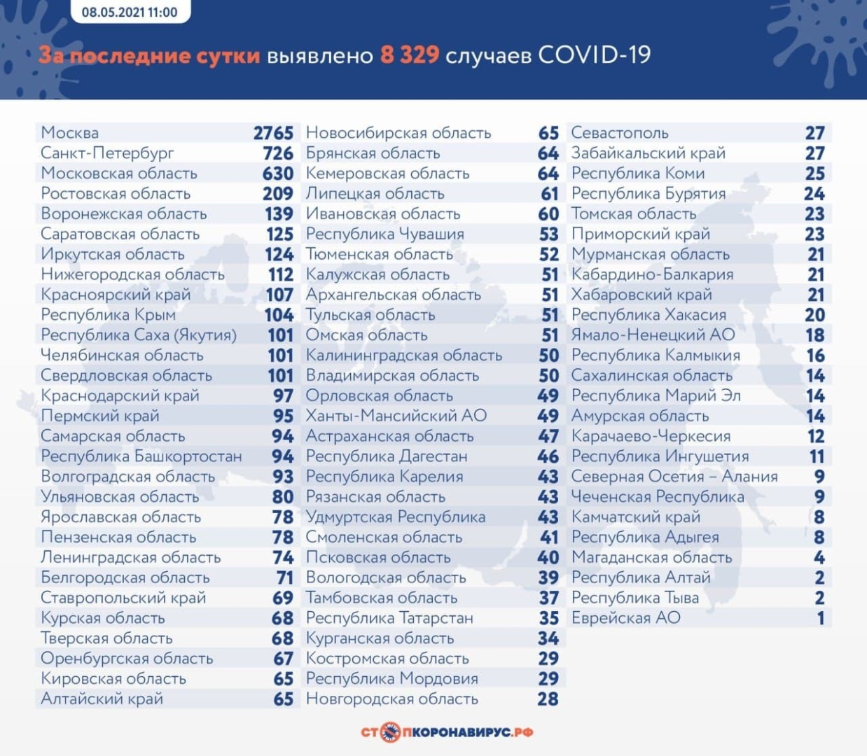 За последние сутки по состоянию на 8 мая 2021 года в России: