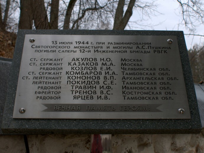 13 июля 1944 года взвод старшего лейтенанта С.Е.Покидова из 157-го инженерно-саперного батальона обнаружил мины на дороге у самой монастырской стены, как раз там, где на холме возвышается памятник поэту. Во время разминирования саперы обнаружили противотанковые мины нового образца, ранее не встречавшиеся. Взрыватель одной из мин был установлен на неизвлекаемость. При попытке обезвредить ее, раздался взрыв. Видно очень спешили саперы и ошиблись. Так и остались здесь на вечные времена.