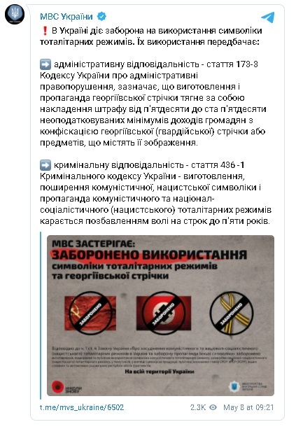 Министерство внутренних дел напомнило, что в Украине запрещено использование «символики тоталитарных режимов» и рассказало об ответственности за невыполнение такого запрета. Соответствующий пост был размещён на официальных страницах Министерства в соцсетях в субботу, 8 мая.