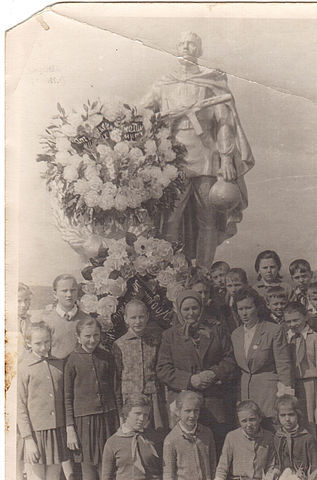 Встреча с детством. 1964-й год. Мы с учительницей Александрой Ивановной убирали территорию возле памятника погибшим советским солдатам, освобождавшим село. Жившая по соседству женщина рассказывала нам об оккупации и об освобождении села. Недавно одноклассница выложила фото в интернете.