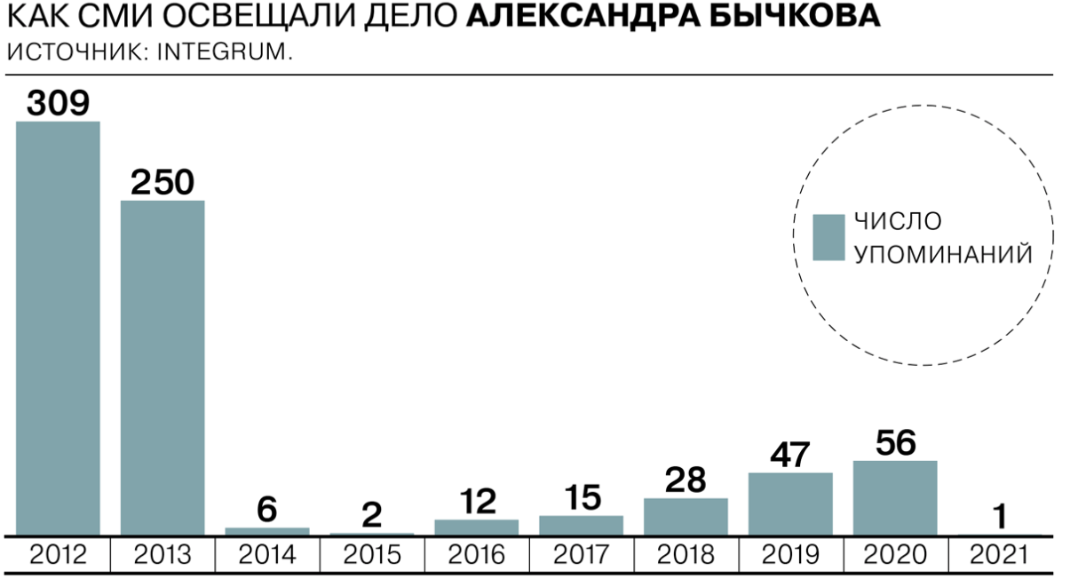 Самое большое количество сообщений об Александре Бычкове вышло в 2012–2013 годы, как раз когда он был задержан и осужден.