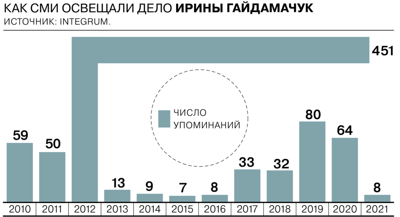 Пик информации о Гайдамачук пришёлся на 2012 год. Именно в 2012 году она была осуждена и приговорена к 20 годам лишения свободы. Начиная с 2017 года имя Ирины Гайдамачук часто встречается в СМИ в материалах под такими заголовками как: