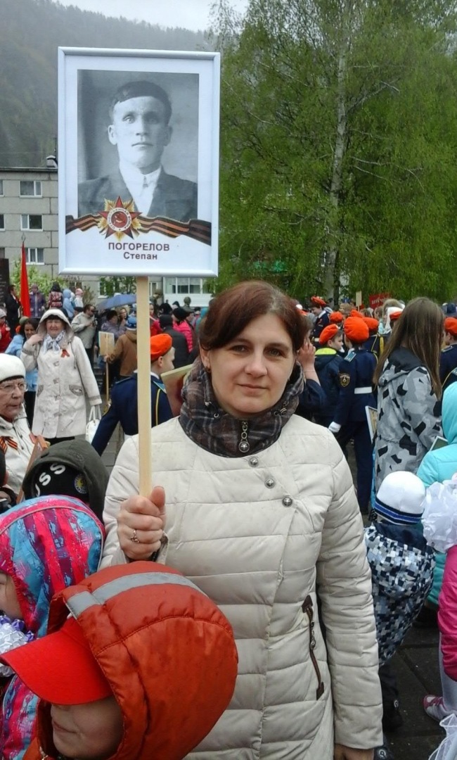 На этой фотографии моя мама и мой прадедушка - ее дед - Степан Погорелов. Бессмертный полк (2018 год). Этот прадедушка ушёл на войну в 1941 году. Но, к сожалению, он не вернулся.