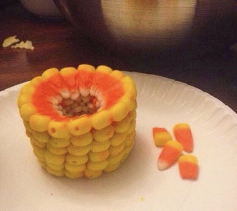 Конфеты кенди корн (candy corn, в переводе — сладкая кукуруза), популярные в США, образуют кукурузу, если сложить их друг на друга