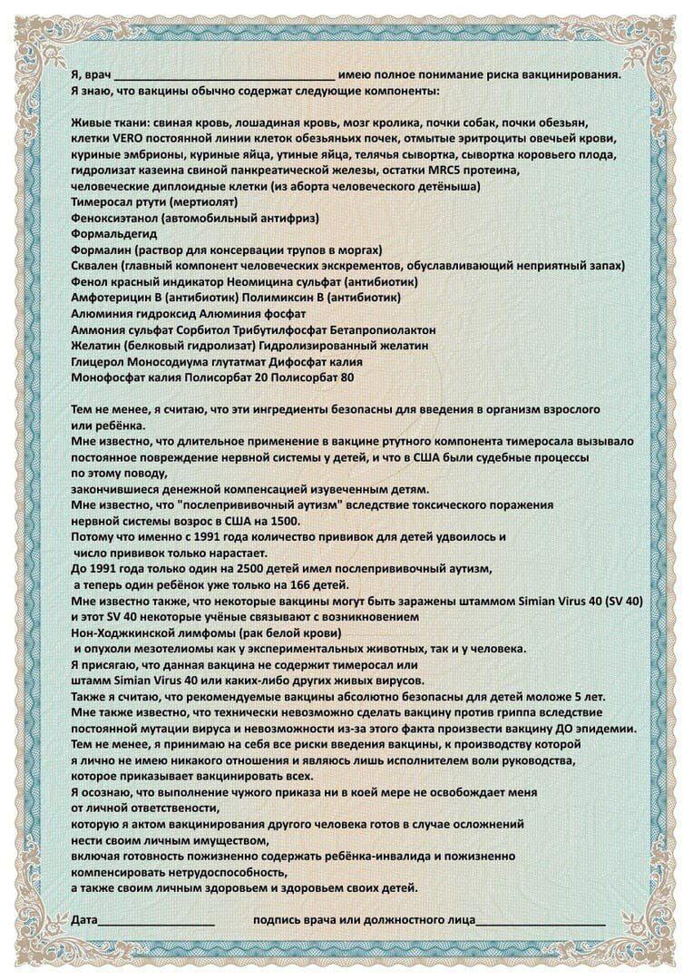Хорошая статья! Так как многие не знают что делать в такой ситуации. Я не доверяю этой прививке и ставить её себе ни в коем случае не буду! Написано всё просто и понятно) ... Так же хотела бы приложить фото (надеюсь что загрузилось нормально). Вдруг пригодится кому. Этот бланк мне дали в ЕЮС (Европейская юридическая служба). Не уверена что врач подпишет данный документ перед тем как делать прививку от ковида.