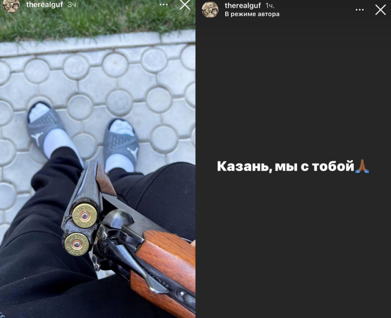 В аккаунте музыканта появилось фото, где он держит ружьё, похожее на то, из которого 19-летний Ильназ Галявиев расстрелял детей и взрослых. А спустя некоторое время Гуф поделился кадром, где на чёрном фоне было написано: "Казань, мы с тобой".