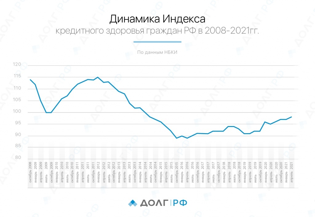 Индекс кредитного здоровья россиян к I кварталу 2021 года заметно укрепился, показав рост на 3 п.п. до 98 п.п. в сравнении с аналогичным периодом прошлого года. К такому выводу пришли аналитики Национального бюро кредитных историй (НБКИ) и компании FICO. Одновременно с этим сократилась доля заемщиков, испытывающих трудности с обслуживанием долгов (до 12,11% с 12,67%).