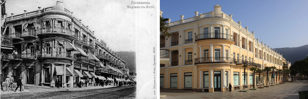 Гостиница на морском побережье. Отель «Мариино» в Ялте — часть экскурсии по чеховским местам. Бывшая дача Казимира Беньковского в ХIX веке благодаря архитектору Николаю Краснову обрела свой изысканный вид, а знаменитый постоялец — Антон Павлович Чехов — добавил романтизма. По местным преданиям, именно в этих местах — из кафе напротив гостиницы — чеховский песонаж Дмитрий Дмитриевич Гуров заметил даму с собачкой: «Сидя в павильоне у Верне, он видел, как по набережной прошла молодая дама, невысокого роста блондинка, в берете; за нею бежал белый шпиц». Эти стены помнят Максима Горького, Владимира Маяковского, Мариуса Петипа и сильное землетрясение, после которого здание лишилось части своей буржуазности: пришлось убрать декоративные бордюры и вазы.