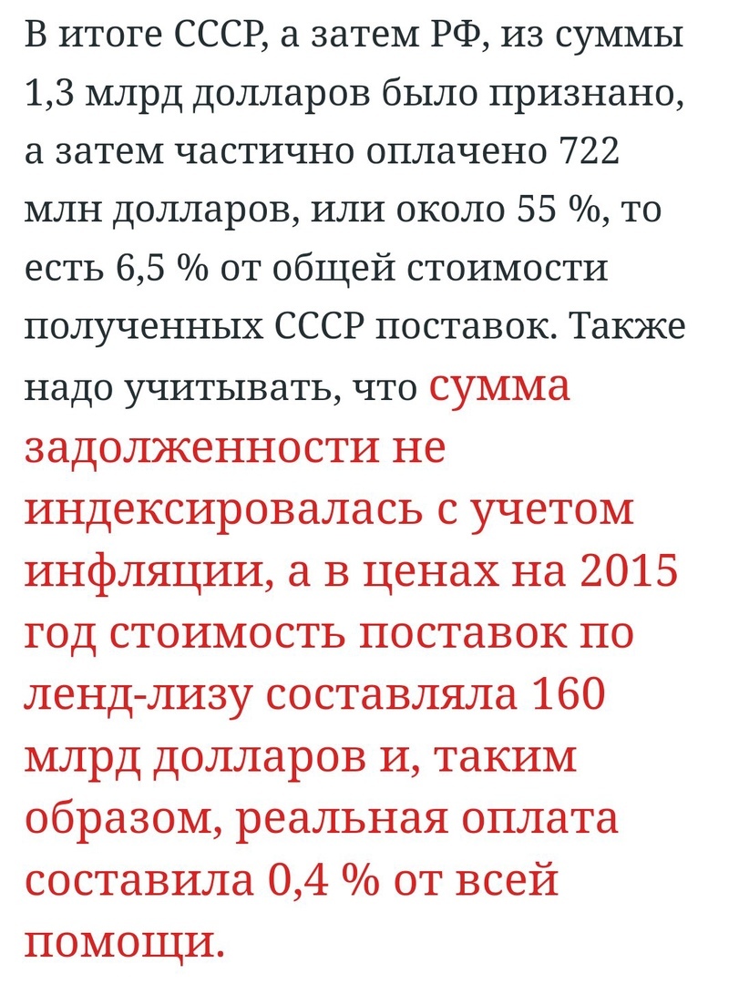 Помощь - помощью, только бесплатно её никто не оказывал. Ленд-лиз, государственная программа, по которой США поставляли своим союзникам Во Второй Мировой войне боеприпасы, технику, продовольствие, медицинское оборудование и лекарства, стратегическое сырьё, включая нефтепродукты. Концепция этой программы давала США возможность помогать любой стране на условиях оплаты всего переданного стране имущества в кредит. Долгосрочные кредиты оформлялись как беспроцентные, но от этого они не переставали быть кредитами, займами. Так что ничего личного, дружба дружбой а денежки врозь.