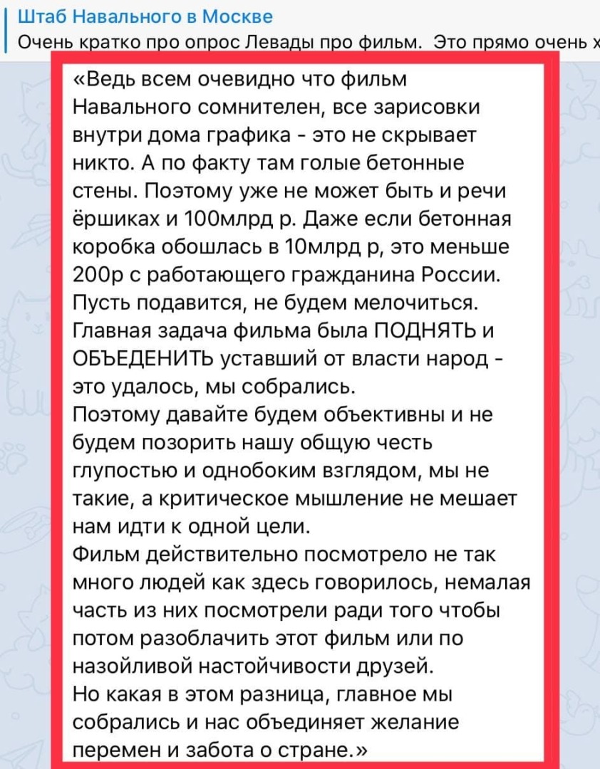 Ни один человек из присутствующих не ответил мне на вопрос о ПРОГРАММЕ перестройки. Как обычно в ответ - пустой треп+ оскорбления. Мда, если вас к власти допустить, даже на вторых ролях, то 1937 год покажется раем. Говоришь, Навальный не врал? ОН ВРЕТ ПОСТОЯННО! НАЧИНАЯ С ОБЕЩАНИЙ ВОЗМЕСТИТЬ ВСЕМ ШТРАФЫ И ЗАПЛАТИТЬ ПО 10000 ЕВРО и КОНЧАЯ ОТРАВЛЕНИЕМ И ДВОРЦОМ ПУТИНА. ТОЛЬКО ЛОХИ ЭТОЙ ЛАЖЕ ВЕРЯТ! Это фейковый фильм о фейковом дворце, а Навального пригласили только для того, чтобы он зачитал подготовленный текст. С самого начала этот фильм был тщательным образом изготовлен специалистами соответствующих западных служб. Еще в 2012 году Борис Немцов, бывший премьер-министр и яростный критик Путина, опубликовал доклад, в котором содержались детали относительно богатства и роскошной собственности, которые были накоплены и приобретены за время пребывания Путина у власти. Там был указан и дворец в Геленджике. В этот доклад были также включены фотографии его шикарных интерьеров. Они вновь появились в расследовании Навального спустя девять лет. Никаких доказательств тогда Немцов не привел. (Но после его смерти наследники до сих пор делят наследство, стоимость которого минимум 1 миллиард $. easy9.ru