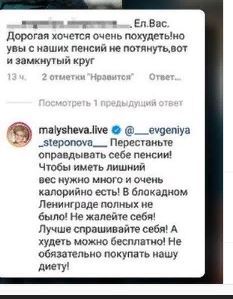 Почему Вы не до конца написали слова Малышевой? Ведь она дальше пишет, что "худеть можно и бесплатно. Не обязательно покупать нашу продукцию". Так рождается клевета и проявляется негатив к другим людям.