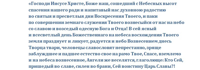 На Вознесение в храмах идут торжественные богослужения. В молитвах особо отмечается, что сегодня сам Бог радуется, Ангелы поют на небесах, и все живущие на земле прославляют Спасителя как истинного Царя.