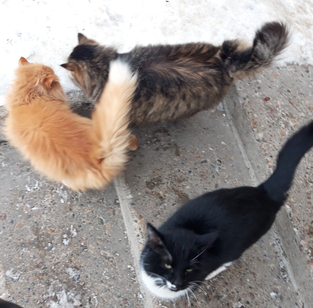 В нашем дворе живут несколько бездомных животных - две собаки и несколько кошек. Мы (жильцы) сделали им прививки, чипировали, подкармливаем. Живут они в картонных коробках, дети их любят и играют с ними. Животные абсолютно не агрессивны, ласковые и игривые.