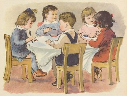 Ребята съели суп и второе. Дежурные убрали тарелки и поставили вместо них блюдца для компота. Няня принесла большую кастрюлю, и в комнате очень вкусно запахло яблоками.