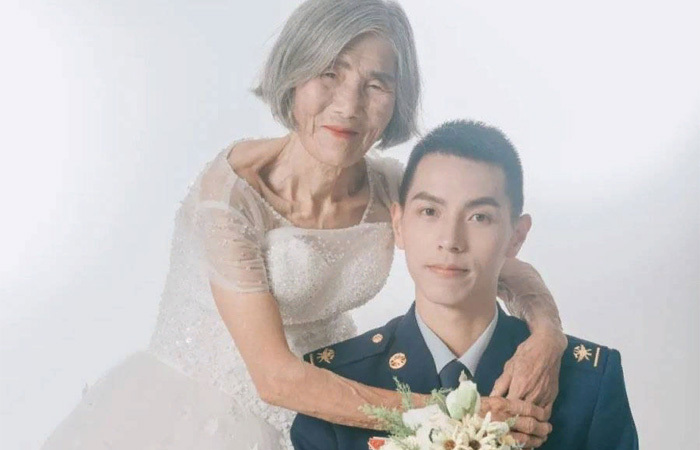 Тогда "сынок" купил ей самый дорогой подвенечный наряд и организовал это фото, где выступил в роли ее супруга, который по причине здоровья не смог прийти на фотосессию.