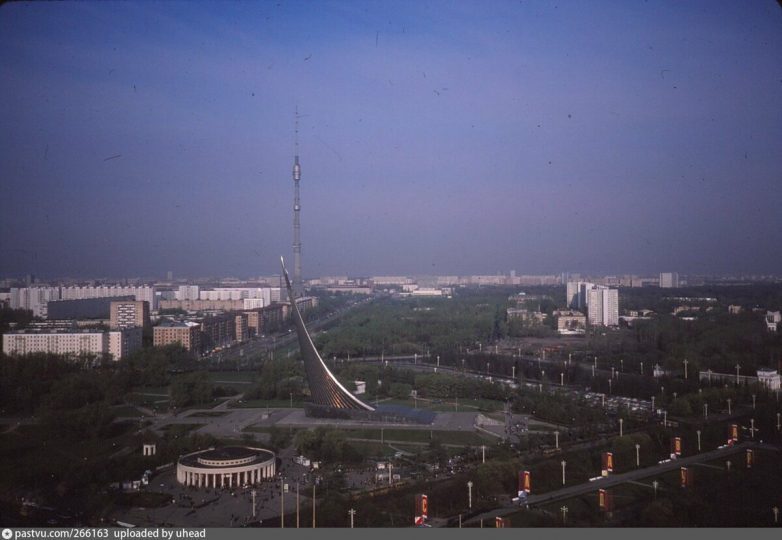 Вид на монумент покорителям космоса и музей космонавтики с гостиницы «Космос», 1987.