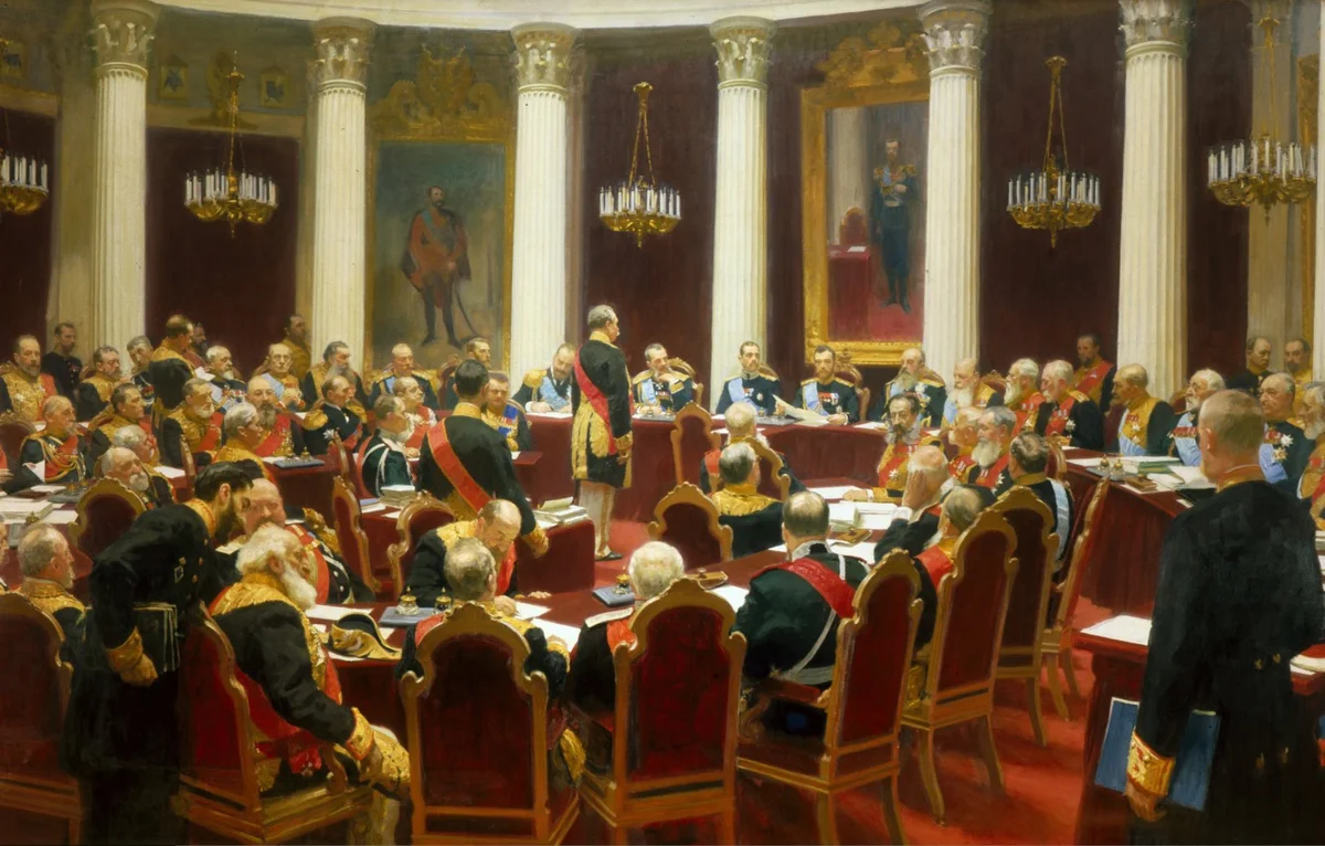 В 1903 году Илья Репин завершил монументальную картину «Торжественное заседание Государственного совета». А в 1905 случилась Первая русская революция, в ходе которой многие государственные чиновники, запечатлённые на картине, сложили головы. Так, бывший генерал-губернатором Москвы великий князь Сергей Александрович и министр В. К. Плеве были убиты террористами.